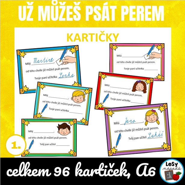 kartičky jsou zpracovány jen s obrázkem ruky, lístku a pera nebo další verze obsahuje pero a hlavičku žáka/žákyně