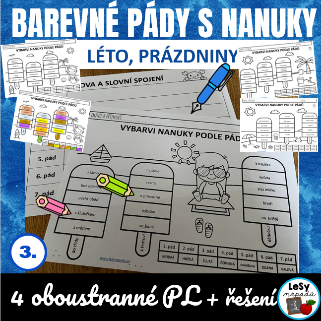 •4 omalovánky, 4 pracovní listy pro zápis slov a slovních spojení (třídění podle pádů)