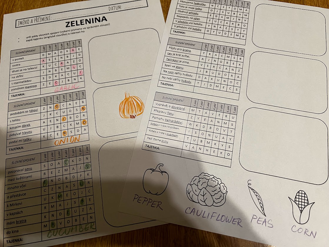 •Žáci si procvičí určování pádů u slovních spojení a vět. Zároveň si procvičují anglickou slovní zásobu z témat zelenina, dům/byt, město. Slovíčka, která neznají, si vyhledají ve slovníku.