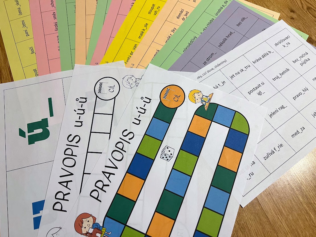 použití: slovo a jeho význam, slovní spojení, pravopis u, ú, ů, kartičky, didaktická hra, desková hra, třídění, odůvodňování
