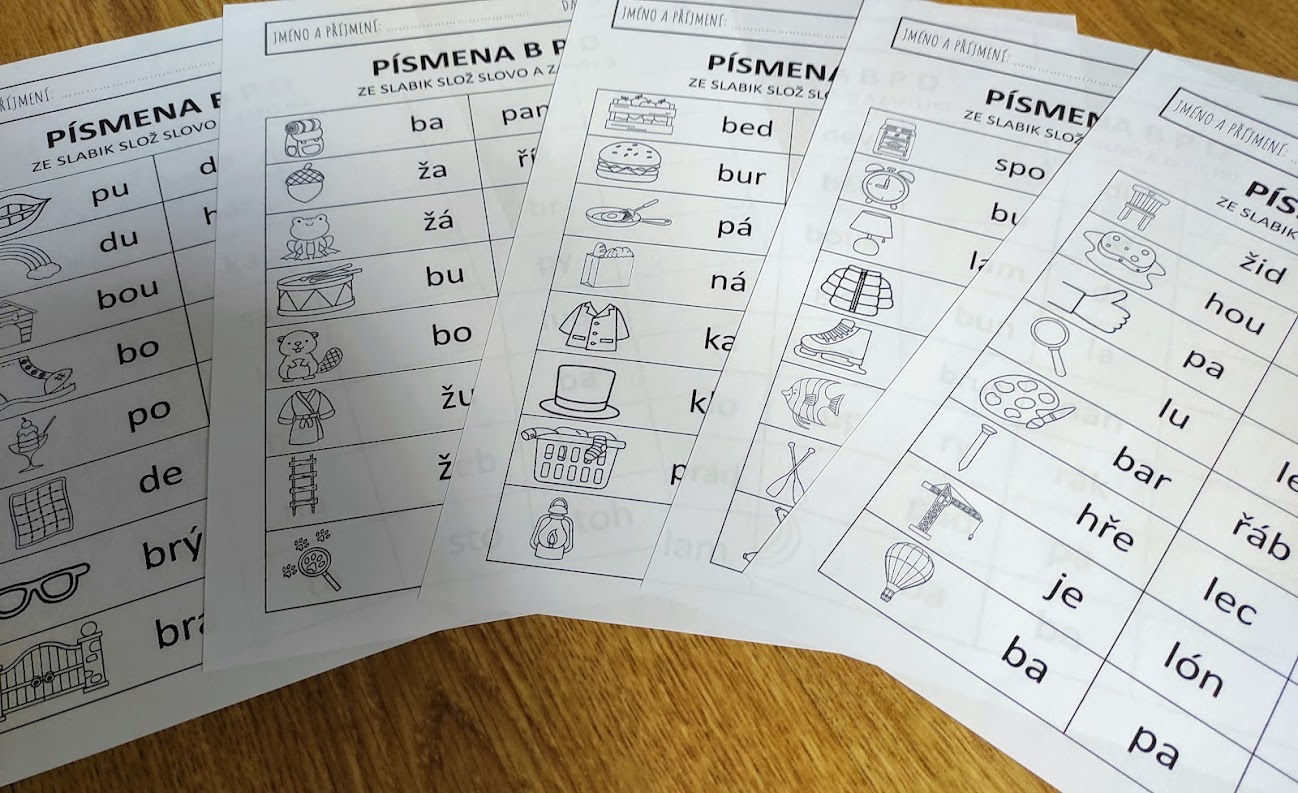 použití: písmeno b p d, skládání slov ze slabik, slovo a obrázek, písmena tiskací a psací