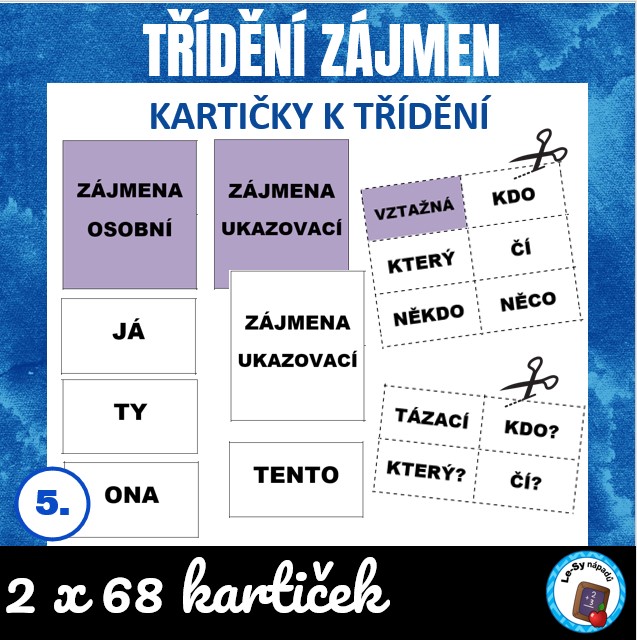 • Materiál obsahuje kartičky s názvy druhů zájmen v barevných polích a kartičky se zájmeny k zatřídění.