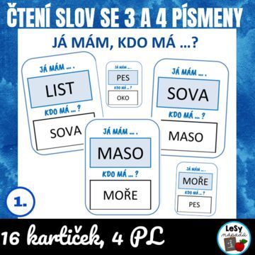 • 16 kartiček pro hru Já mám, kdo má … pro čtení slov se 3 a 4 písmeny