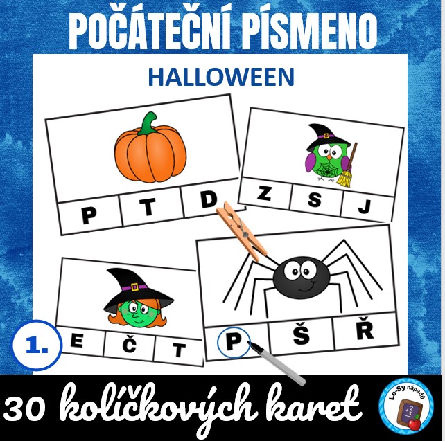 použití: pojmenování obrázků souvisejících se svátkem Halloween, přiřazení počátečního písmene ke slovu, velká tiskací písmena, opakování tvarů písmen