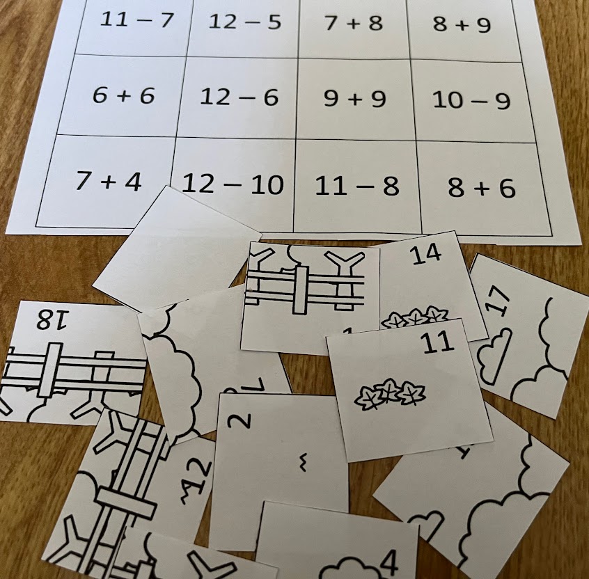 Karta obsahuje pomíchané kartičky. Žáci nechají vcelku kartu s příklady (mohou si je do sešitu opsat), dolní část nastříhají na kartičky (obrázek s výsledkem). Ty lepí na daný příklad.