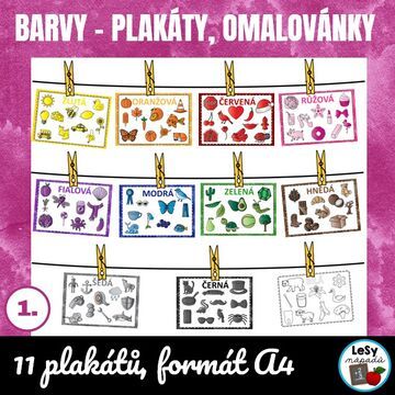 •11 černobílých plakátů k vybarvení předmětů danou barvou (pro bílou barvu je pouze 1 plakát tzv. barevný i čb v jednom J