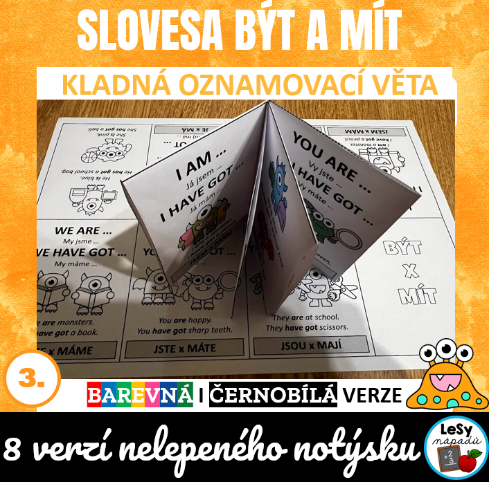 •celkem 8 stran na formátu A4 – 2 motivy nelepeného notýsku (příšerky a mix motivů), barevná verze (1. černá barva textu, 2. červeně zvýrazněné tvary sloves být a mít, 3. červeně zvýrazněné tvary slovesa být a modře slovesa mít), čb verze