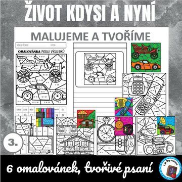 •6 pracovních listů na formátu A4 ve tvaru omalovánky podle zadání – porovnání života kdysi a nyní