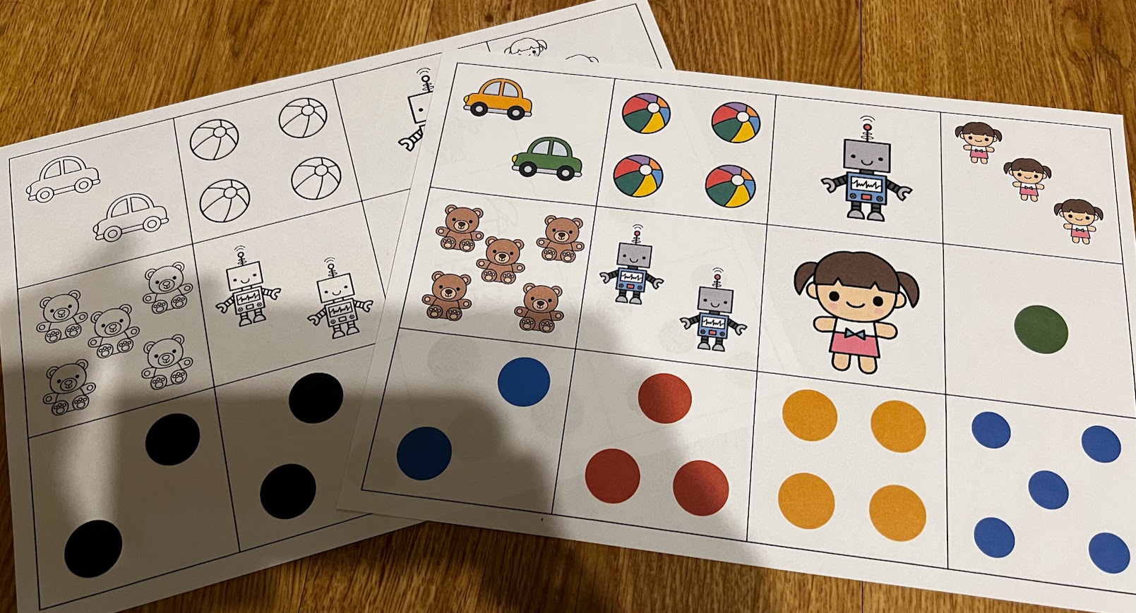 •počet do 5 – kartičky s puntíky a obrázky, 12 kartiček na formátu A4 v barevné i čb verzi (5 karet s puntíky vpočtu 1-5, 7 karet s obrázky)