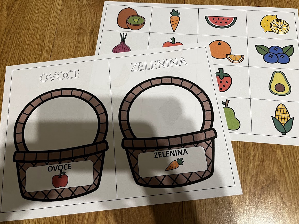 •ovoce a zelenina – 2 karty formátu A5 s košíky pro ovoce a zeleninu, 16 kartiček s ovocem a zeleninou v barevné i čb verzi