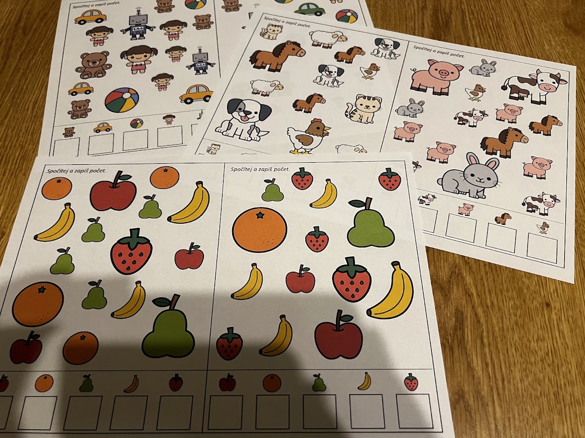 •počet do 5 – orientace na ploše, karty formátu A5 (6 barevných a 6 čb) s tématy zvířata, hračky, ovoce a zelenina