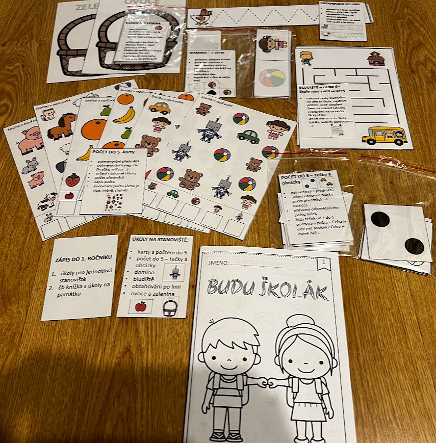 •Dále je připravena „knížka“ pro budoucí školáky, kterou tvoří 2 listy formátu A4, po složení formát A5 s 8 stranami. Je zpracována v čb verzi a buď ji můžete využít na místě, např. při čekání dětí na nějakou aktivitu, případně dát domů jako dárek, protože obsahuje tytéž aktivity jako byly na stanovištích. Vzadu je navíc praktické desatero pro předškoláky, tedy jakési shrnutí, co by měl budoucí školák zvládnout.