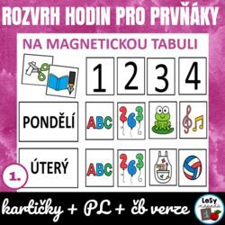 Rozvrh hodin pro prvňáky na magnetickou tabuli.