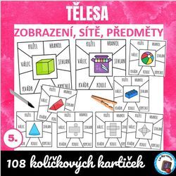 108 kolíčkových kartiček - zobrazení tělesa, sítě těles a reprezentanti těles v běžném životě