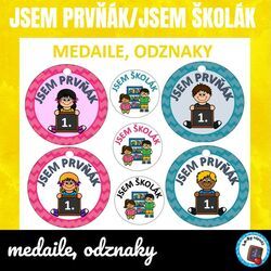 Motivační medaile a odznaky pro prvňáčky s nápisem JSEM PRVŇÁK a JSEM ŠKOLÁK.