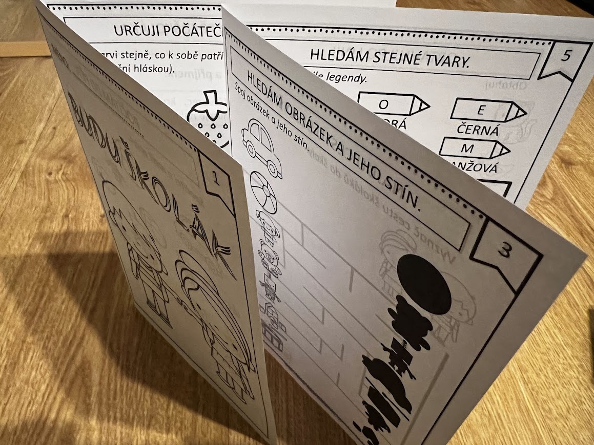 •Dále je připravena „knížka“ pro budoucí školáky, kterou tvoří 2 listy formátu A4, po složení formát A5 s 8 stranami. Je zpracována v čb verzi a buď ji můžete využít na místě, např. při čekání dětí na nějakou aktivitu, případně dát domů jako dárek, protože obsahuje tytéž aktivity jako byly na stanovištích. Vzadu je navíc praktické desatero pro předškoláky, tedy jakési shrnutí, co by měl budoucí školák zvládnout.