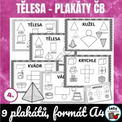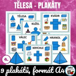9 plakátů - tělesa, jejich sítě, obrázky těles z běžného života