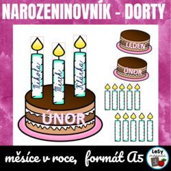 Dorty s názvy měsíců k výzdobě třídy a tvorbě narozeninovníku, svíčky k dopsání jména.