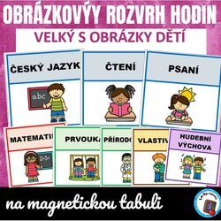 Obrázkový rozvrh hodin na magnetickou tabuli s obrázky dětí.