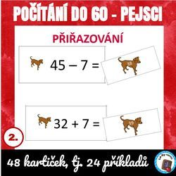 48 kartiček, tj. 24 příkladů a 24 výsledků pro počítání do 60 s motivem pejska