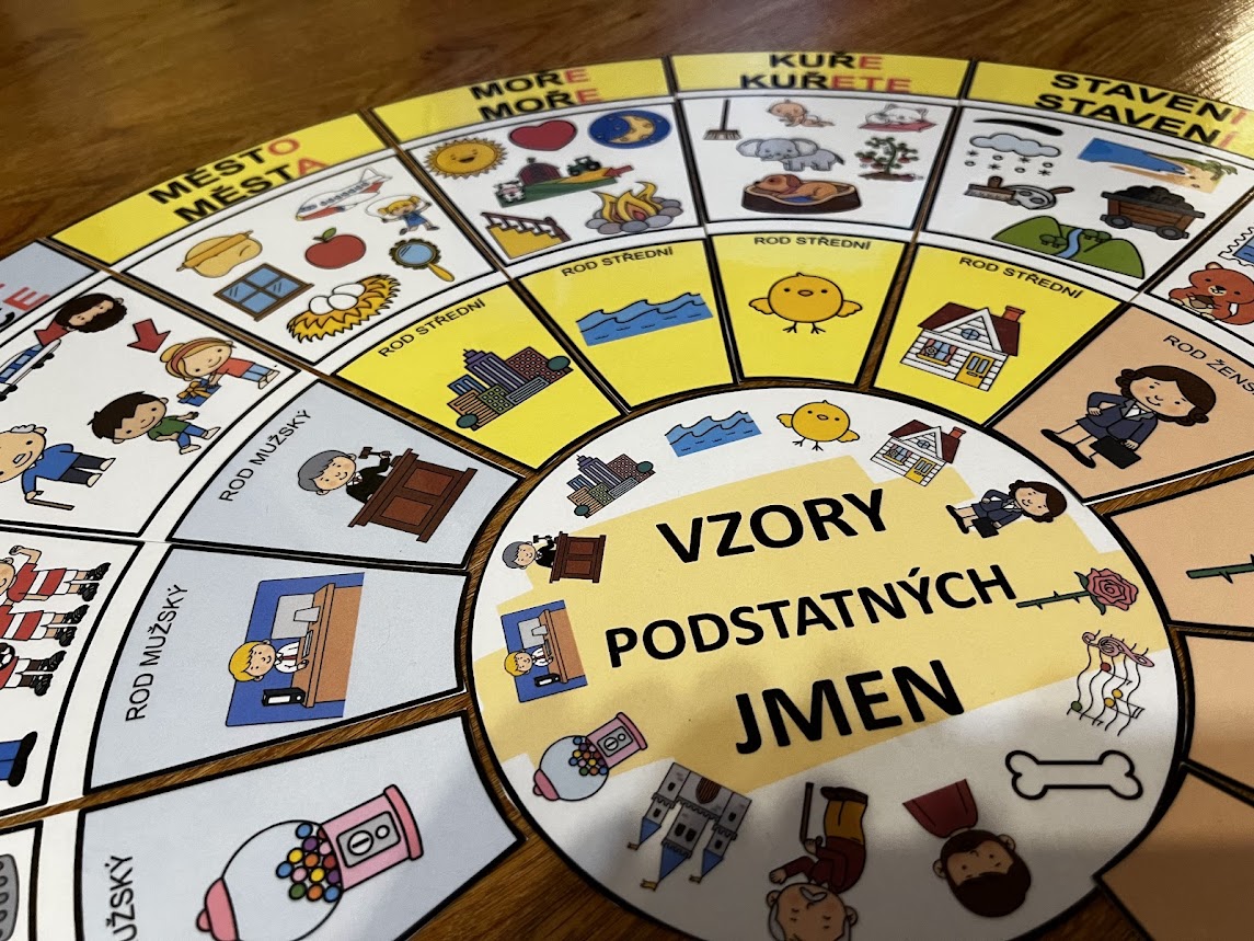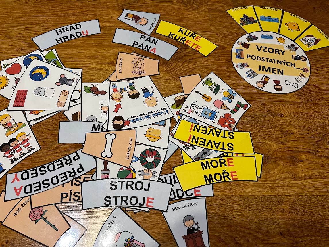 •středová kartička je kruhová, kolem ní se skládají jednotlivé dílky se 14 vzory podstatných jmen
