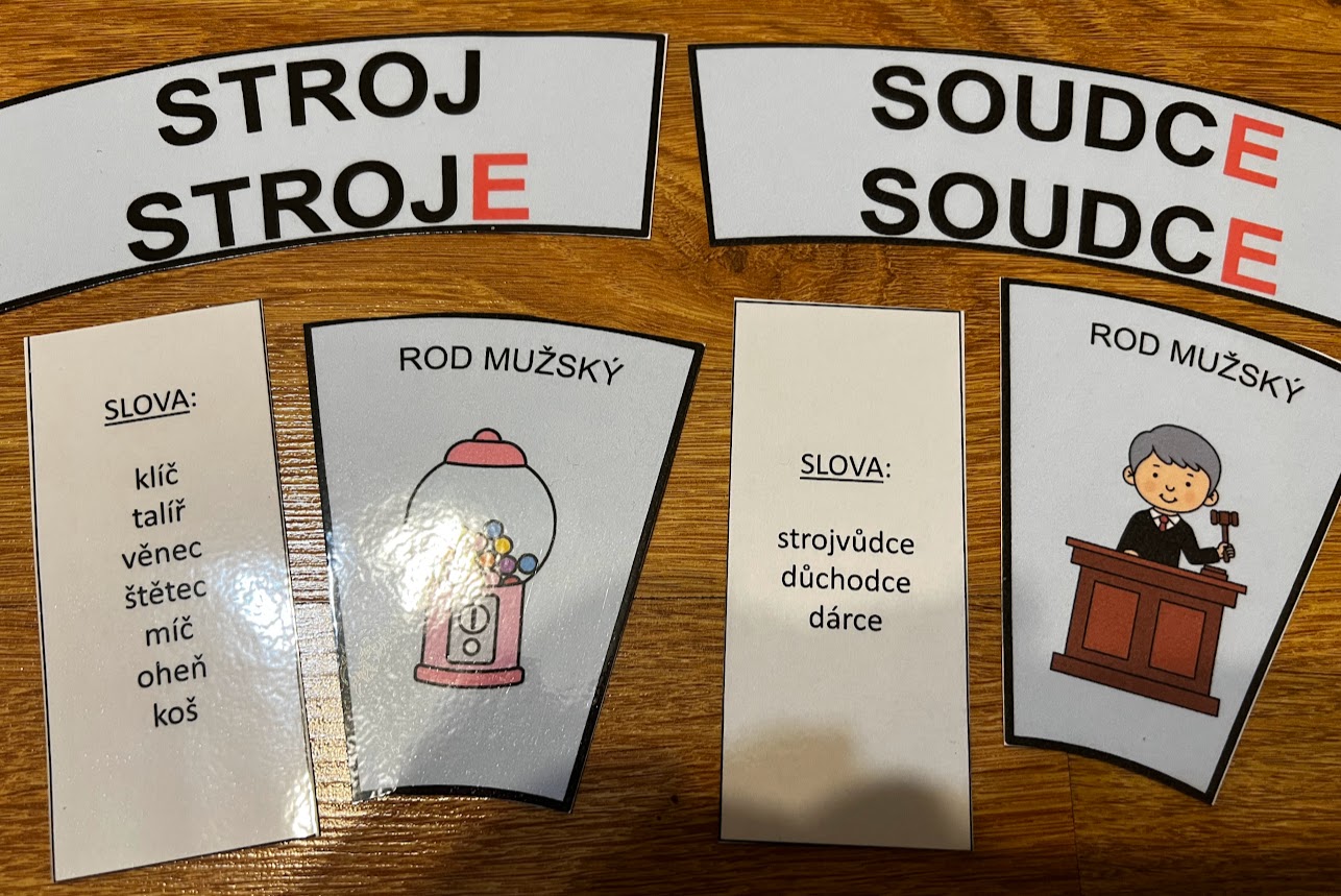 •na kartičkách je obrázek vzoru, obrázky slov k danému vzoru a vzor v 1. a 2. pádě čísla jednotného