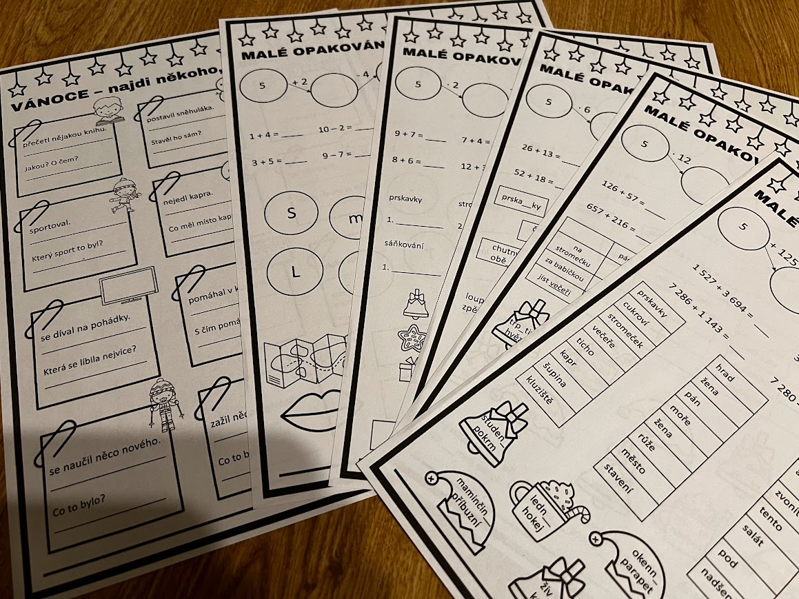Pro 1. ročník je určeno pouze opakování, tj. 1 strana pracovního listu, pro 2.-5. ročník je oboustrann pracovní list, tj. aktivita Najdi někoho kdo ... a z druhé strany opakovací cvičení, která obsahují početní řetězec a příklady na numeraci v daném oboru a 2-3 úkoly z českého jazyka.