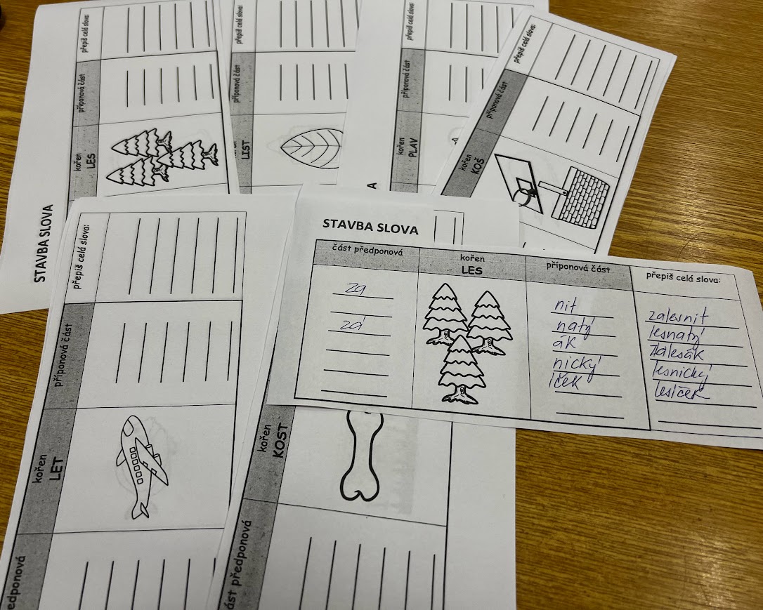 - 1 samostatný pracovní list k vlastní tvorbě žáků (dokreslí a dopíší si kořen, poté tvoří slova)
