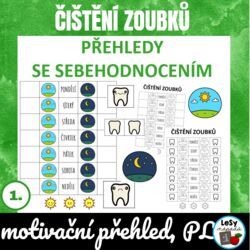Motivační přehled pro děti k čištění zoubků se sebehodnocením na formátu A4 na výšku.