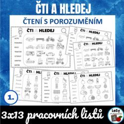 13 pracovních listů na čtení s porozuměním a orientaci na ploše, každý list ve trojím vyhotovení (velká tiskací písmena, malá tiskací písmena a psací písmo)