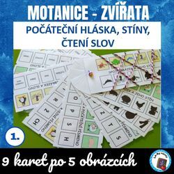 Motanice se zvířaty - obsahuje obrázky, stíny k přiřazení, první písmena slov a slova ke čtení.