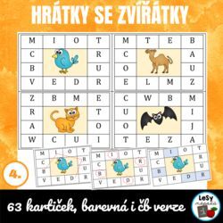 63 kartiček v barevné i čb verzi pro vyhledávání písmen, která tvoří název zvířete na obrázku