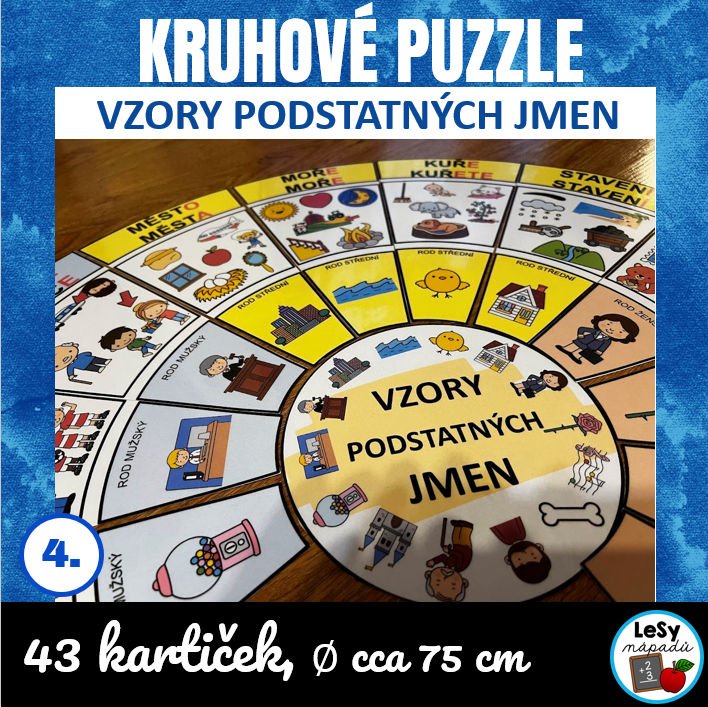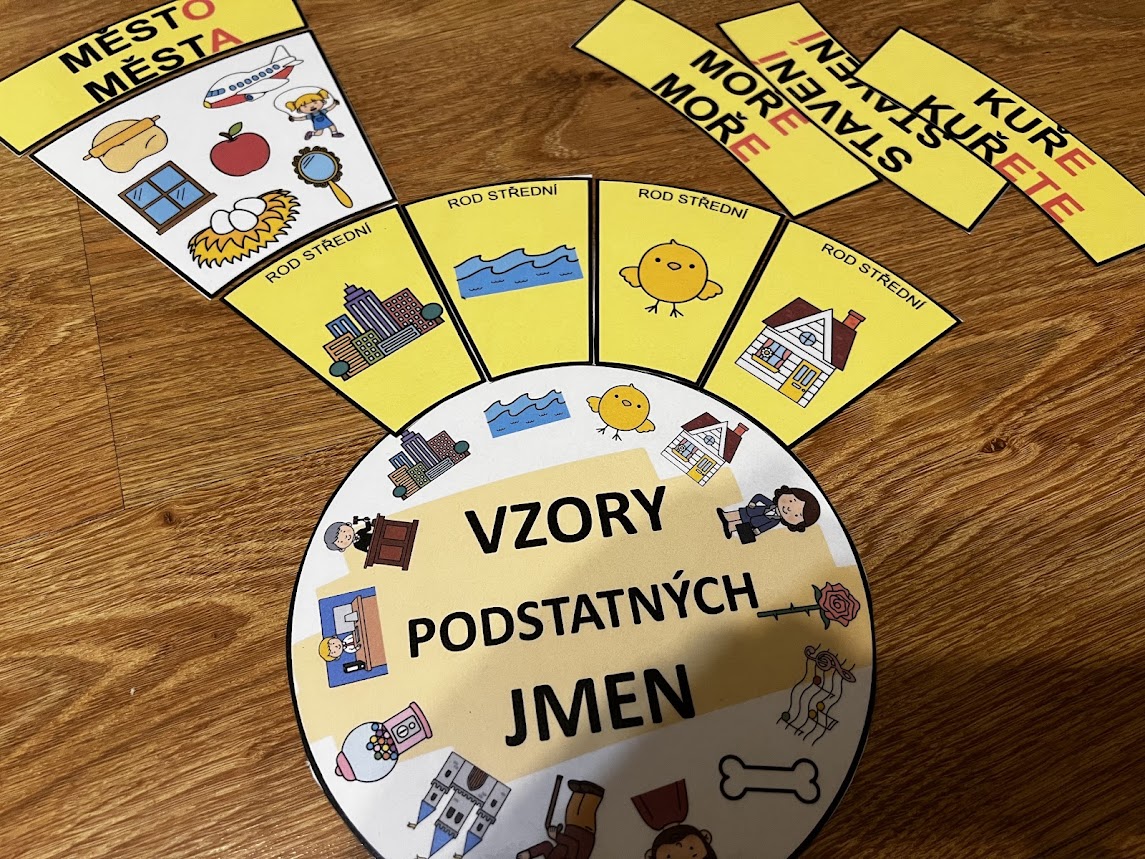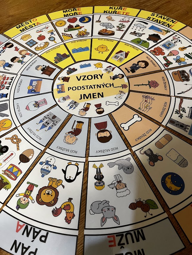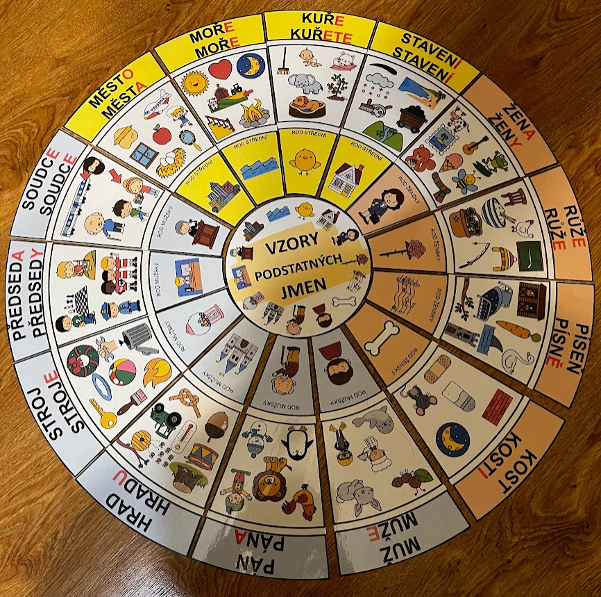 •středová kartička je kruhová, kolem ní se skládají jednotlivé dílky se 14 vzory podstatných jmen